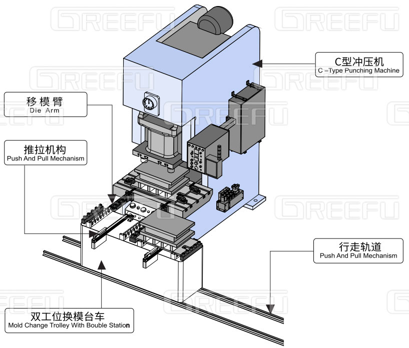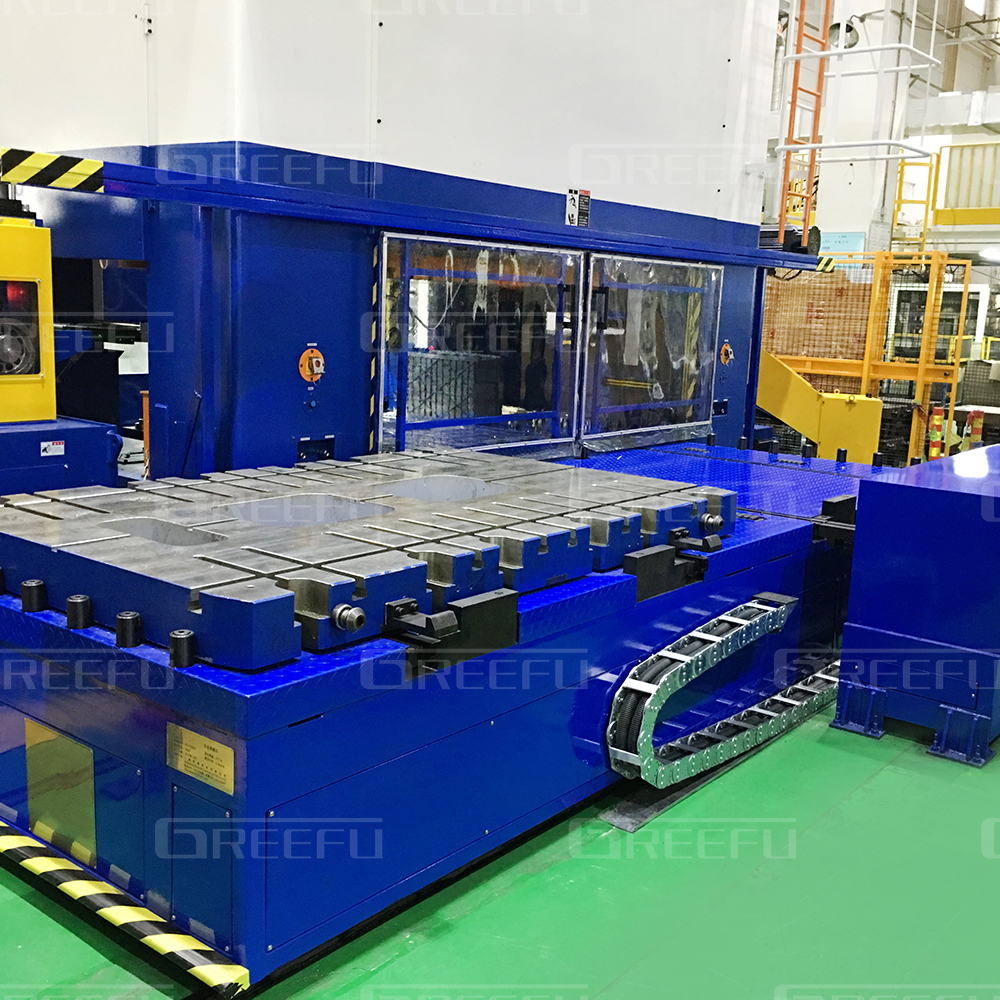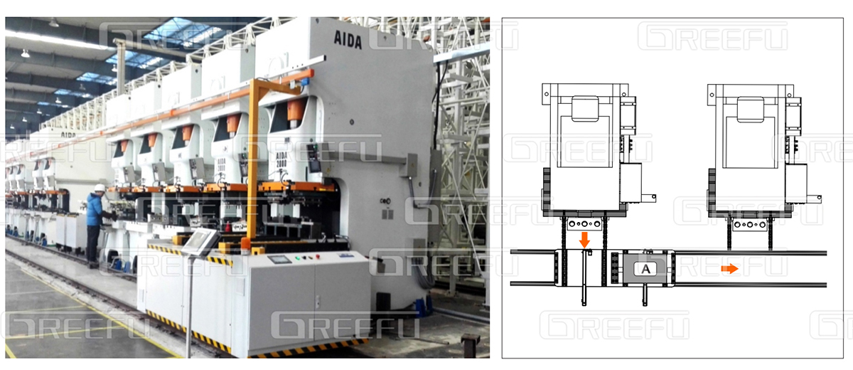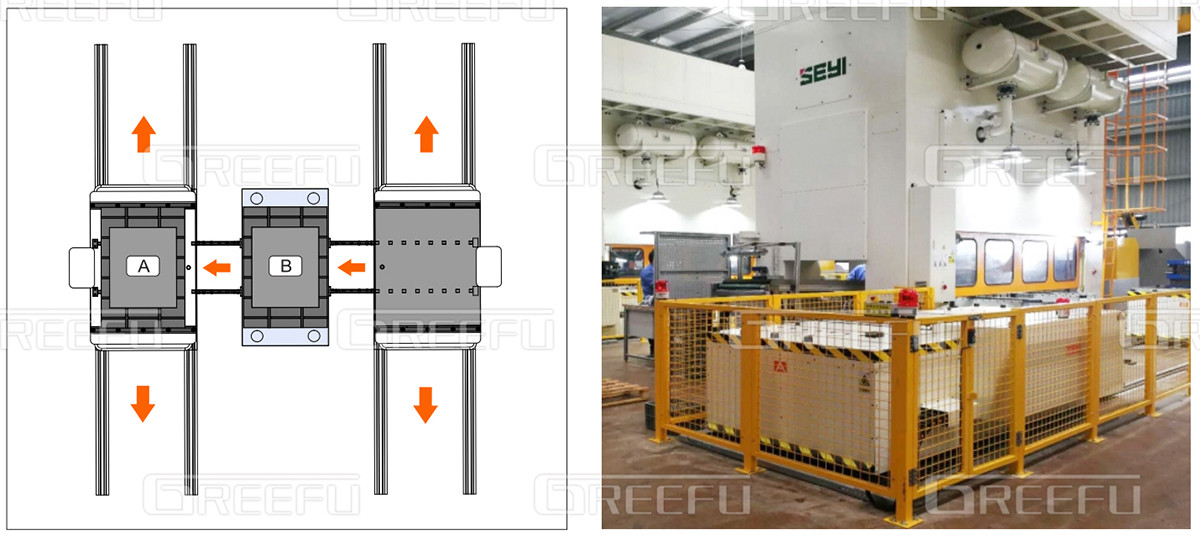 多臺沖床共用一套自動換模臺車系統,該“自動換模臺車系統”能有效解決大型模具的換模作業,如汽車鈑金、家電電梯等行業沖壓零件,且格萊富可依各種獨立作業需求研究開發各種搬運臺車,并可設計單鍵全自動或半自動對模具的搬入搬出,同時,現在該模具輸送系統也已逐漸被業內接受與采用,尤其是,汽機車零組件等需大型模具的制造業等。